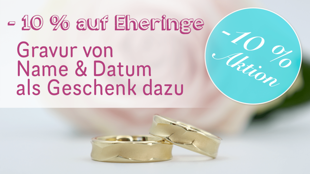 Wir lieben es, die schönsten Momente des Lebens mit Euch zu teilen. Deswegen gibt es -10% auf Eheringe und die Gravur von Euren Namen und Eurem Hochzeitstag schenken wir Euch noch dazu.